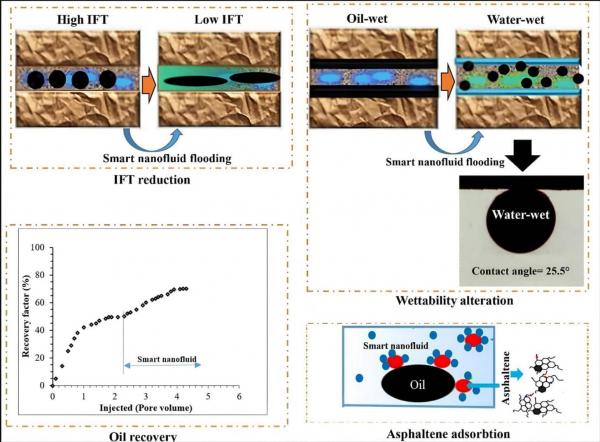 Наножидкость готовится на основе умягченной воды с низким содержанием солей, что значительно повышает рентабильность технологии. В нее добавляют два типа наночастиц (микроскопических элементов размером с молекулу, способных просачиваться в мельчайшие пустоты): алюминиевые и кремниевые. Первые помогают жидкости просачиваться в мельчайшие пустоты породы и разрушать скопления сырья снаружи. В то время как вторые ведут «точечную работу» изнутри — они проникают в залежи углеводородов и разрушают их структуру. После чего плотные нефтяные массы теряют свою целостность, распадаясь на множество мелких капель. Это создает условия для эффективного вытеснения — вода легко подхватывает образовавшиеся частицы и направляет их к скважине.